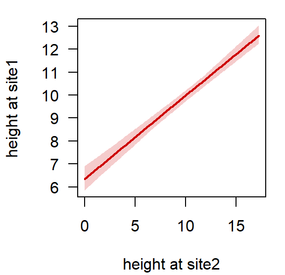 ## 1 1 6.728533 0.258385 6.256851 6.708606 7.218249This tells us that a height of 1 m at Site 2 would correspond to a mean height of 6.7 m at Site 1, for this alignment.