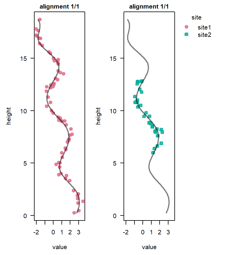 The plot() function displays the alignment corresponding to an approximate multivariate median of the converted heights (see Eichenseer et al. 2025). If a Cluster analysis reveals more than one distinct possible alignment, the most likely alignment is shown by default.